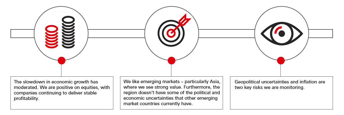 In terms of markets, while US equities have run ahead in recent years, Japan and Europe still look attractive to us. Within emerging markets, Asia stands out, where we again see strong value. Furthermore, the region doesn't have some of the political and economic uncertainties that other emerging market countries currently have, via new regimes, pending elections or inconsistent growth.