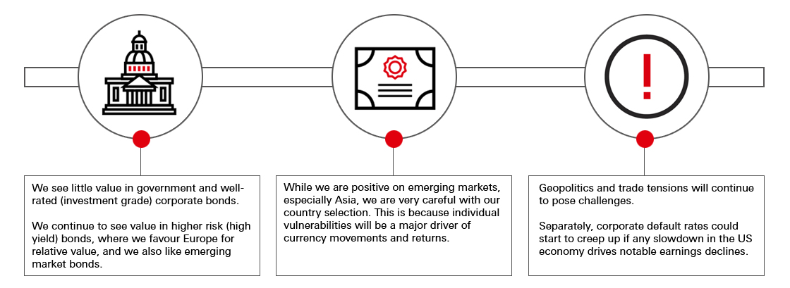 Growth in emerging economies seems to be recovering, led by improvements in China. Trade tensions will still pose challenges, but we think that a number of emerging market asset classes are relatively attractively-priced and have the potential to outperform if key risks don’t materialise. Nonetheless, worries over risks may limit return potential in the near-term.
