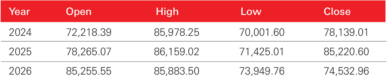 Source – BSE India. Period under consideration for all three indices is Jan 1, 2024 to March 20, 2026. “Open” represents the index level on Jan 1 of the respective year. “High” and “Low” represent the highest and lowest levels recorded during the year. “Close” represents Dec 31 for 2024 and 2025, while the closing level for 2026 is March 20, 2026. Past performance may or may not be sustained in the future.