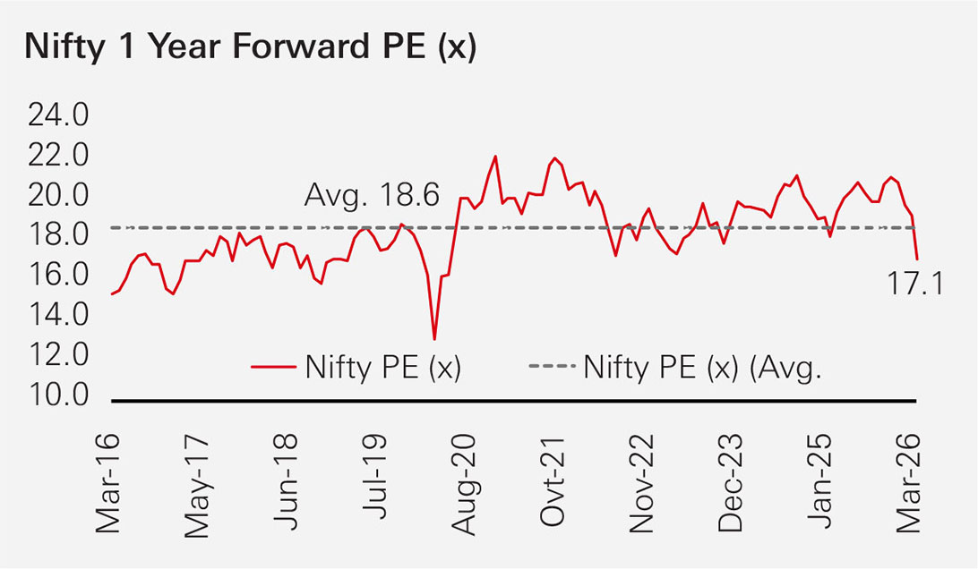 As of 23 March 2026, the Nifty 50 is trading at a 1-year forward Price-to-Earnings (P/E) multiple of around 17.1x, which is below its long-term average levels, indicating a meaningful cooling in valuations compared to the earlier phase of the rally.