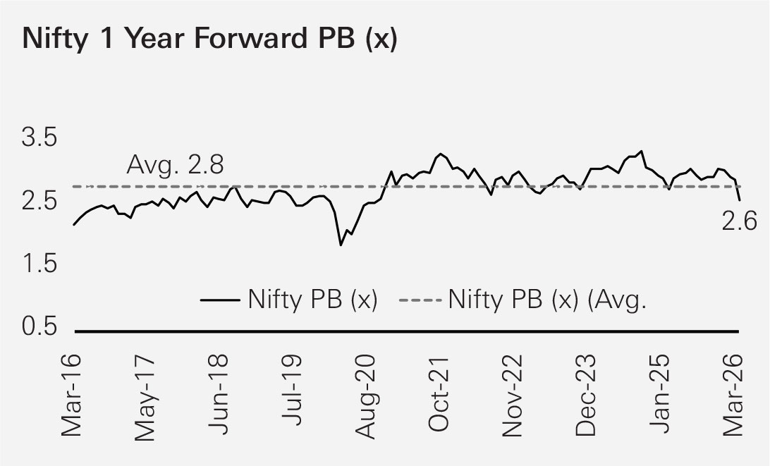 Similarly, the Price-to-Book (P/B) ratio stands at around 2.6x, also trending close to historical averages. This moderation reflects how the recent consolidation phase has helped normalise valuations that had become elevated during the previous market upcycle.