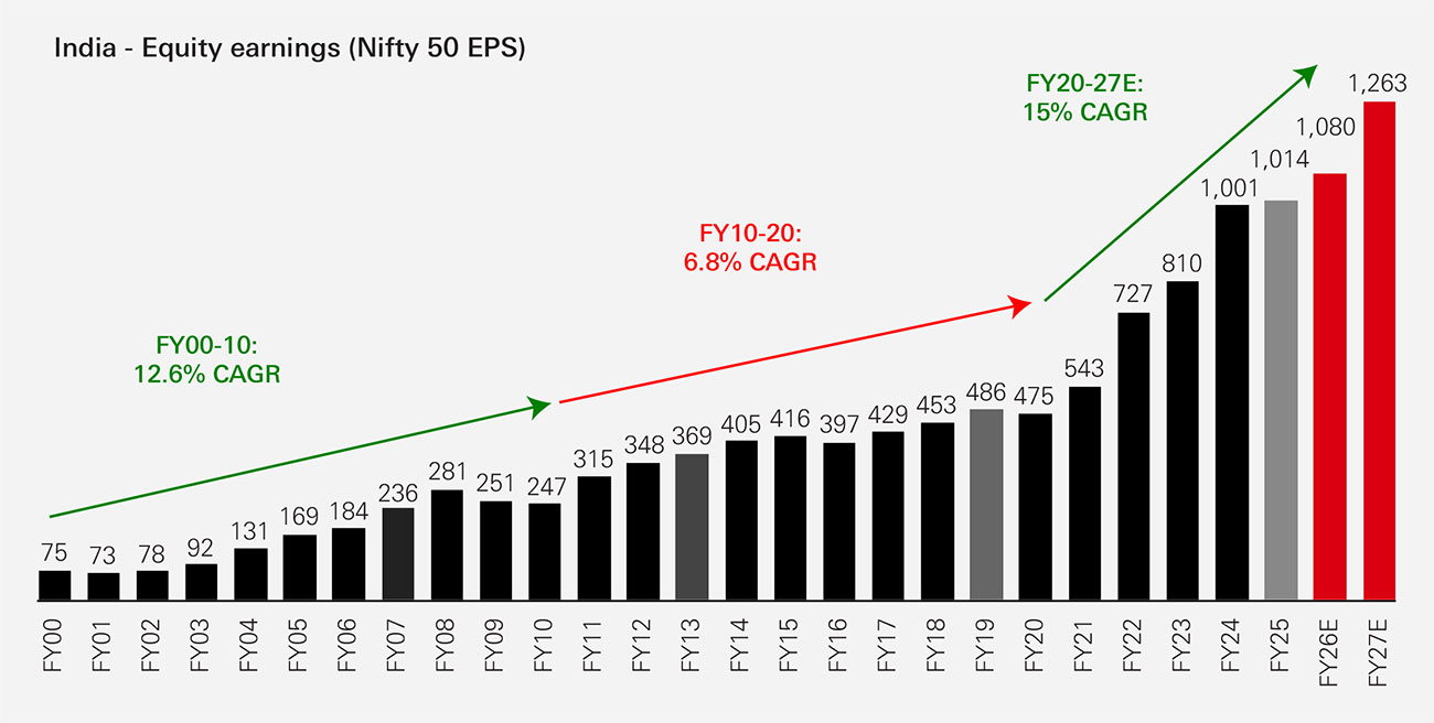 Historical data shows that corporate earnings growth has evolved across different phases. Between FY00–FY10, Nifty 50 earnings grew at a CAGR of around 12.6 per cent, followed by a relatively slower phase of ~6.8 per cent CAGR between FY10–FY20.